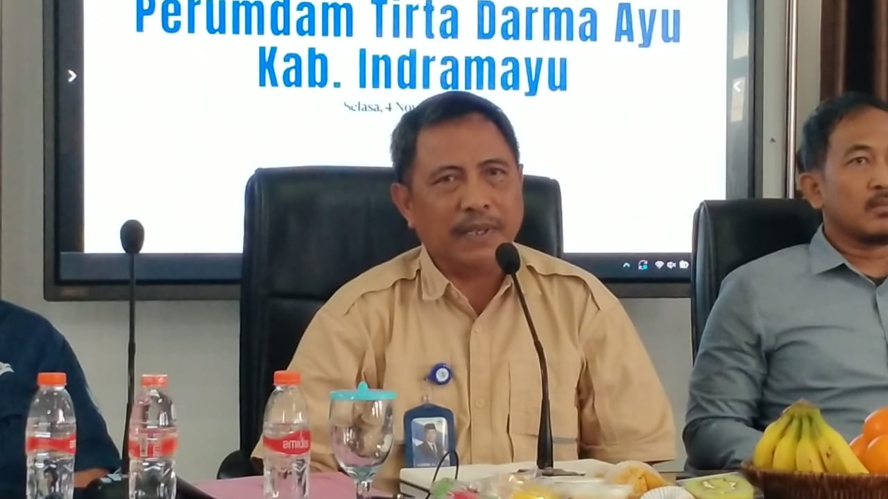 Direktur Utama Perumdam Tirta Darma Ayu Indramayu, Nurpan, memberikan keterangan kepada media mengenai upaya perluasan jaringan layanan air bersih di empat kecamatan di Kabupaten Indramayu. (foto/mandanews/riyan)