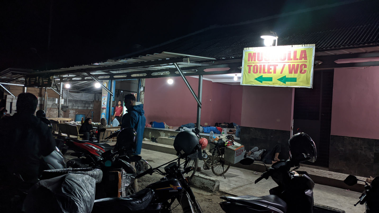 Pengendara yang mampir untuk sekedar buang air, ditunggu keluar dari dalam toilet. Setelah keluar, pengendara ditagih bayar.