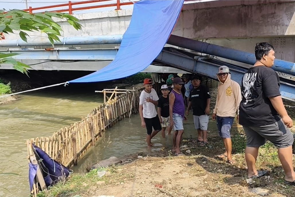 Mereka membendung sebagian aliran sungai menggunakan anyaman bambu, kemudian menyusun kayu sebagai alas perlintasan agar kendaraan roda dua dapat melintas dengan aman di bawah jembatan beton Pantura.